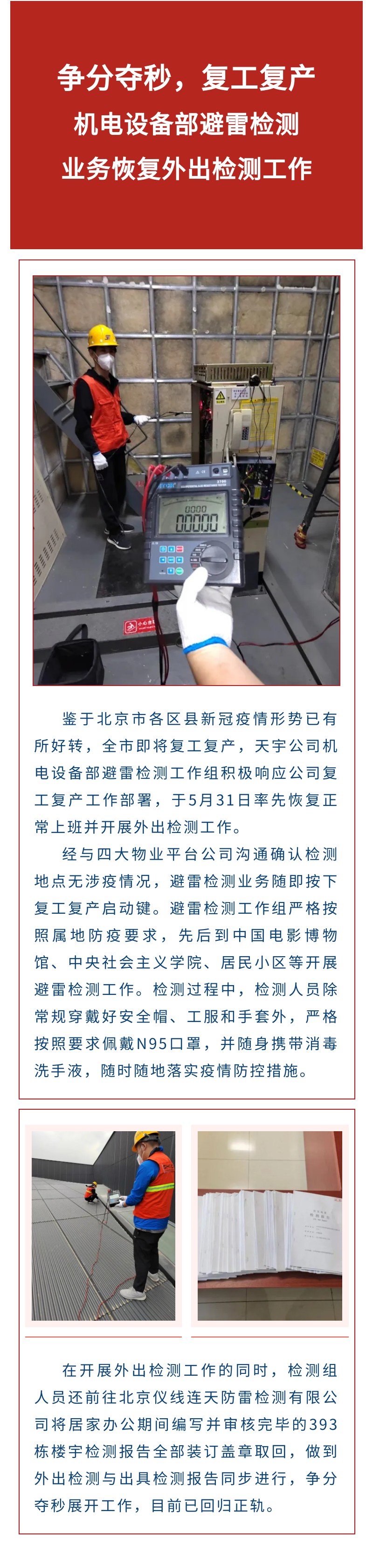 争分夺秒,复工复产——机电设备部避雷检测业务恢复外出检测工作