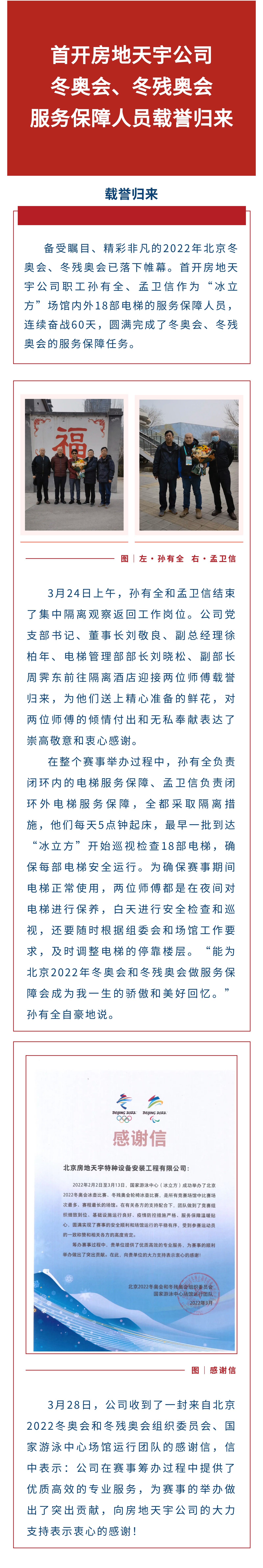 房地天宇公司冬奥会、冬残奥会 服务保障人员载誉归来