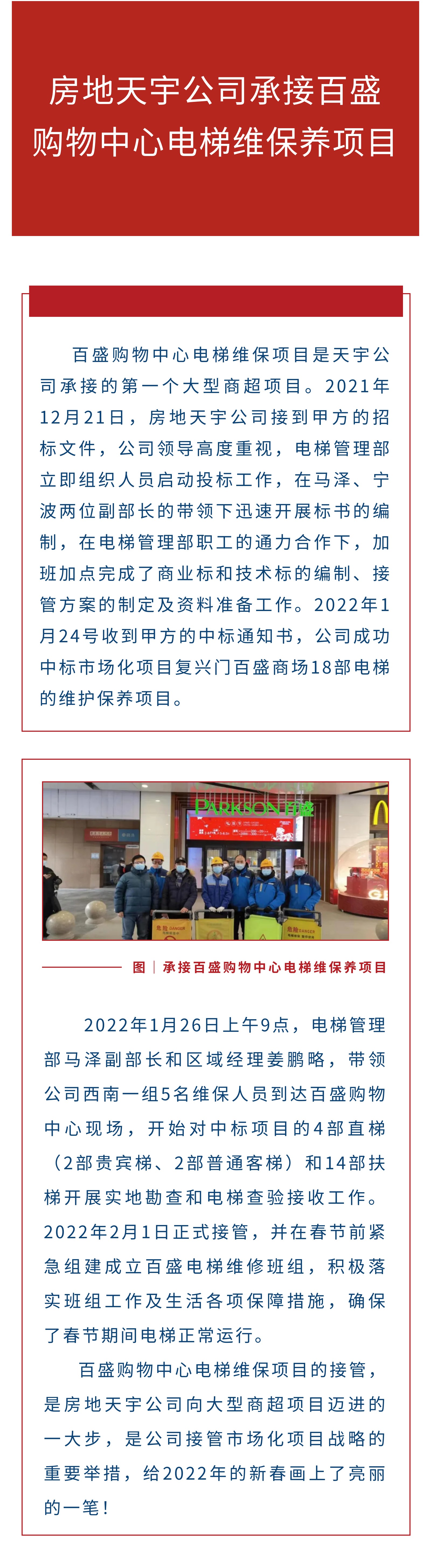 房地天宇公司承接百盛购物中心电梯维保养项目