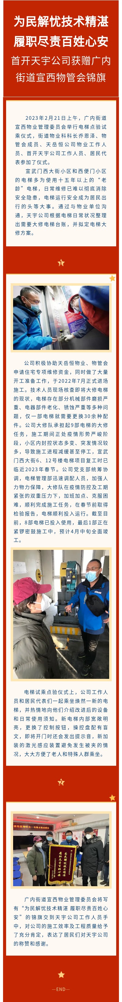 为民解忧技术精湛 履职尽责百姓心安—首开天宇公司获赠广内街道宣西物管会锦旗
