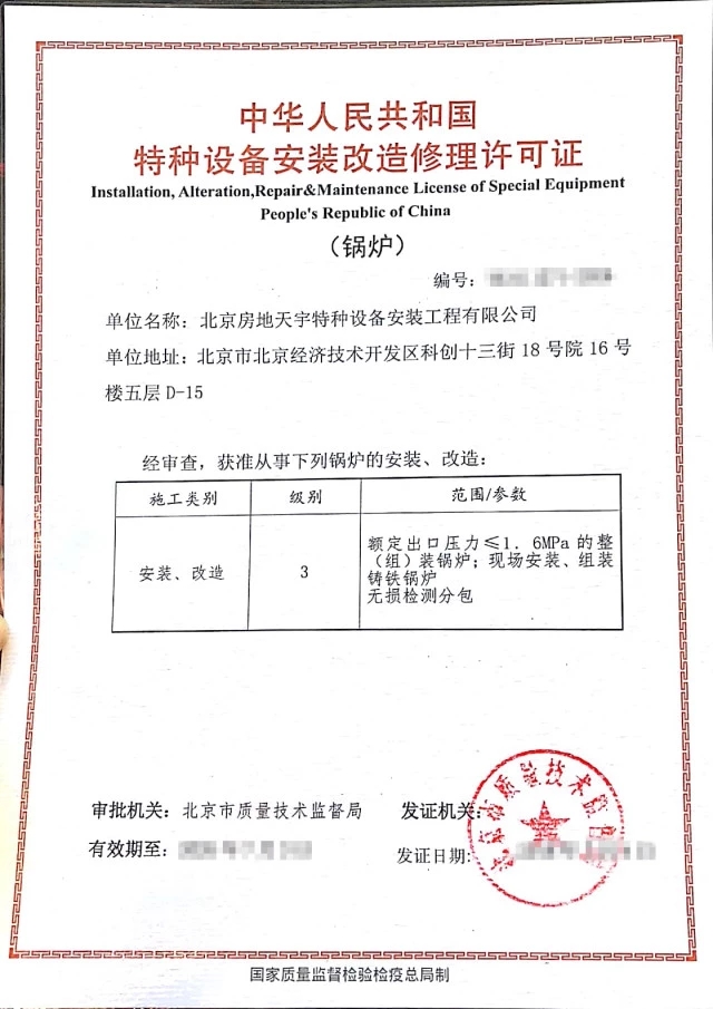 经过领导班子和相关部室、事业部的共同努力,房地天宇公司近日取得了由北京市质量技术监督局颁发的《中华人民共和国特种设备安装改造修理许可证(锅炉3级)》证书。