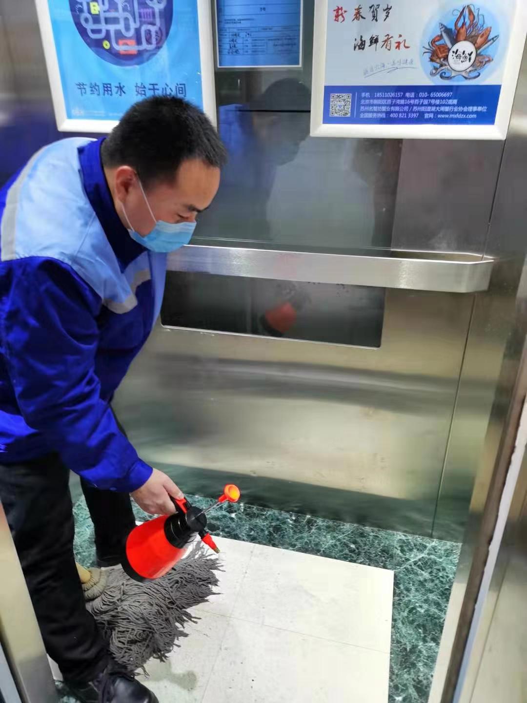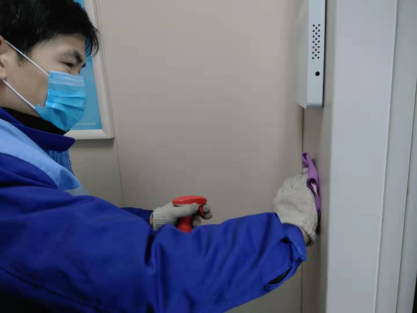 配置物资,全面防控。公司急购口罩、体温计、消毒液、喷壶、橡胶手套等物资,要求一线工作人员佩戴口罩上岗,做好自身防护。返京人员每天监测体温并报告身体状况。公司很多电梯维修师傅们依然坚守岗位,每天坚持对老楼加装的电梯轿厢等重点部位消毒,保障着居民特别是老年人的出行安全。